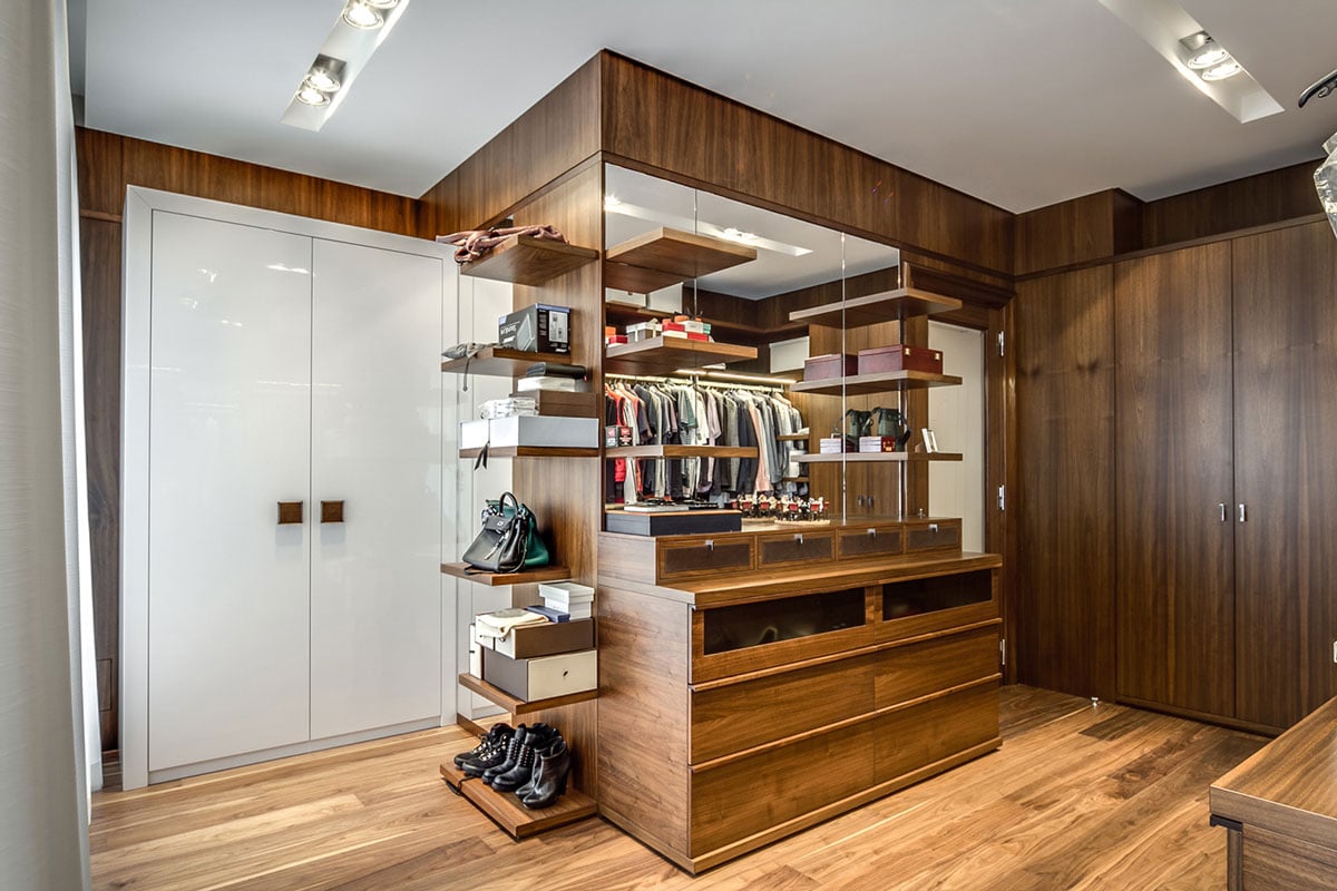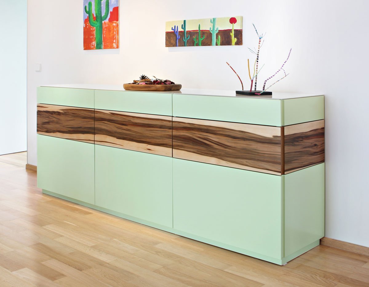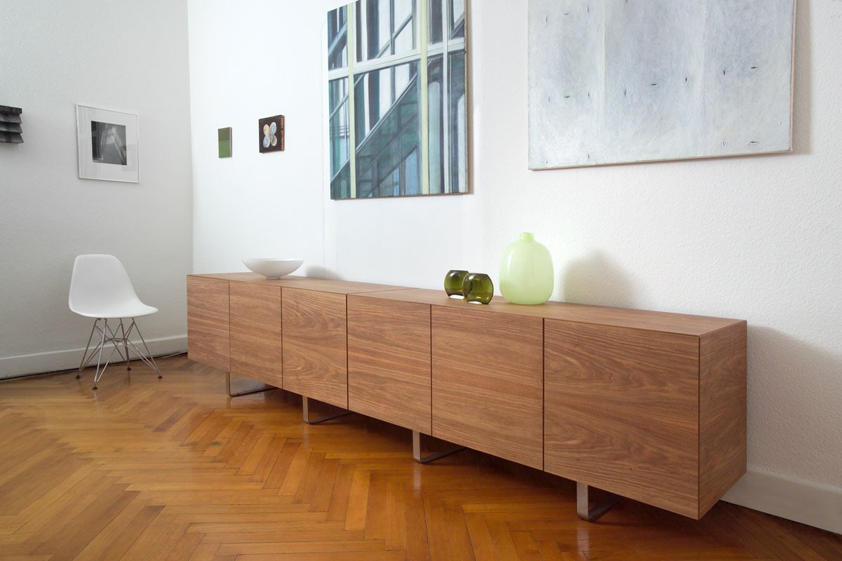 The structure and color of American walnut differs from European walnut with its strong gray-brown color and its clearly striped or veined structure. The veneer pattern creates a dignified ambience. However, American walnut often has fingernail-sized ingrowths, known as bird pecks, which lead to a loss of quality and make it difficult to find good veneer qualities.