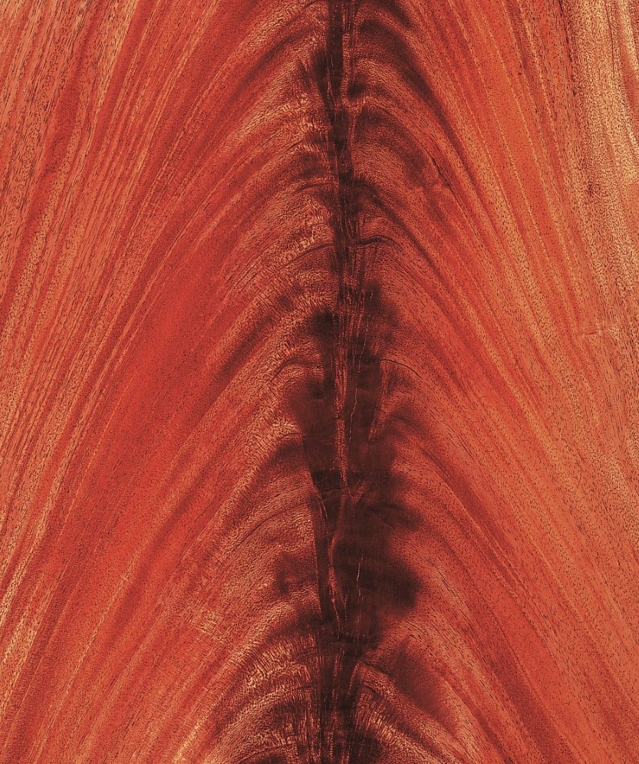Veneer produced from crotches or curls of African mahogany are beautiful works of art whose mysterious light and shadow contrasts present the viewer with a vivid and fiery image. The soft reddish brown tone with a slight golden shimmer intensifies the beauty of the wood. Truly lovely pyramid qualities are very rare and extremely valuable.