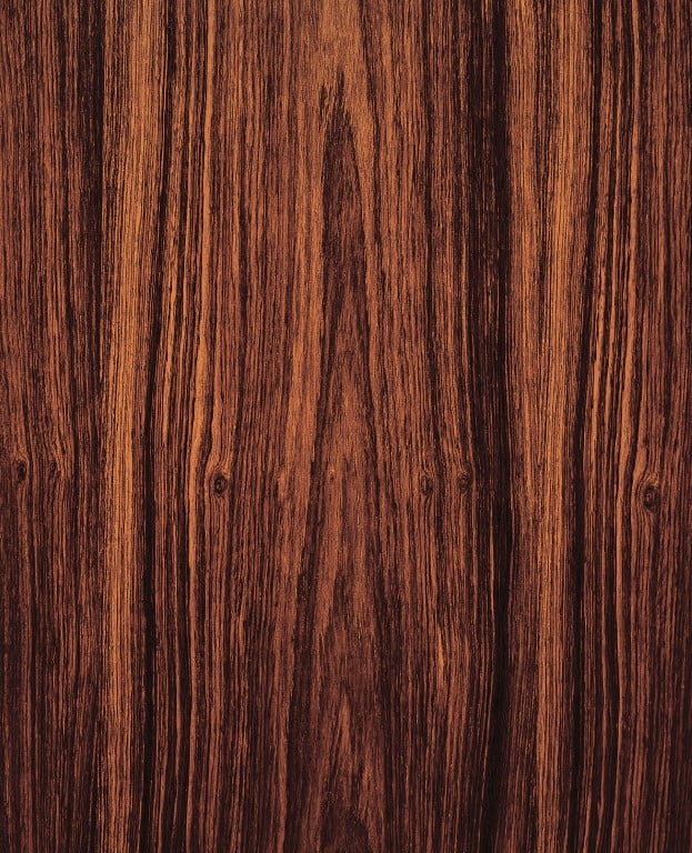 Exclusive and attractive are fitting adjectives for the veneer figure in East Indian rosewood. Like others in the rosewood family, this veneer has a vivid curly or stripy figure. The elegant brown hue ranges from red to violet and even to black. It is the dark combinations of violet to blackish brown that make this veneer particularly lively. The veneer is mildly influenced by the frequently occurring mineral deposits in the wood.