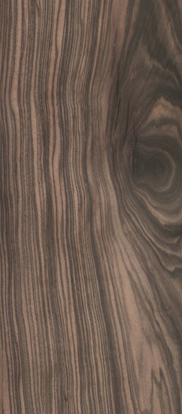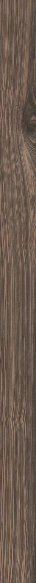 Ebony is an extremely hard species. Its elegant and dark veneer figure contains a grayish brown to reddish brown color with dark brown to black stripes. The smooth and strikingly radiant surfaces have a characteristic striped appearance. Dark mineral deposits can occasionally be seen in the vessel lines on the lateral surfaces.