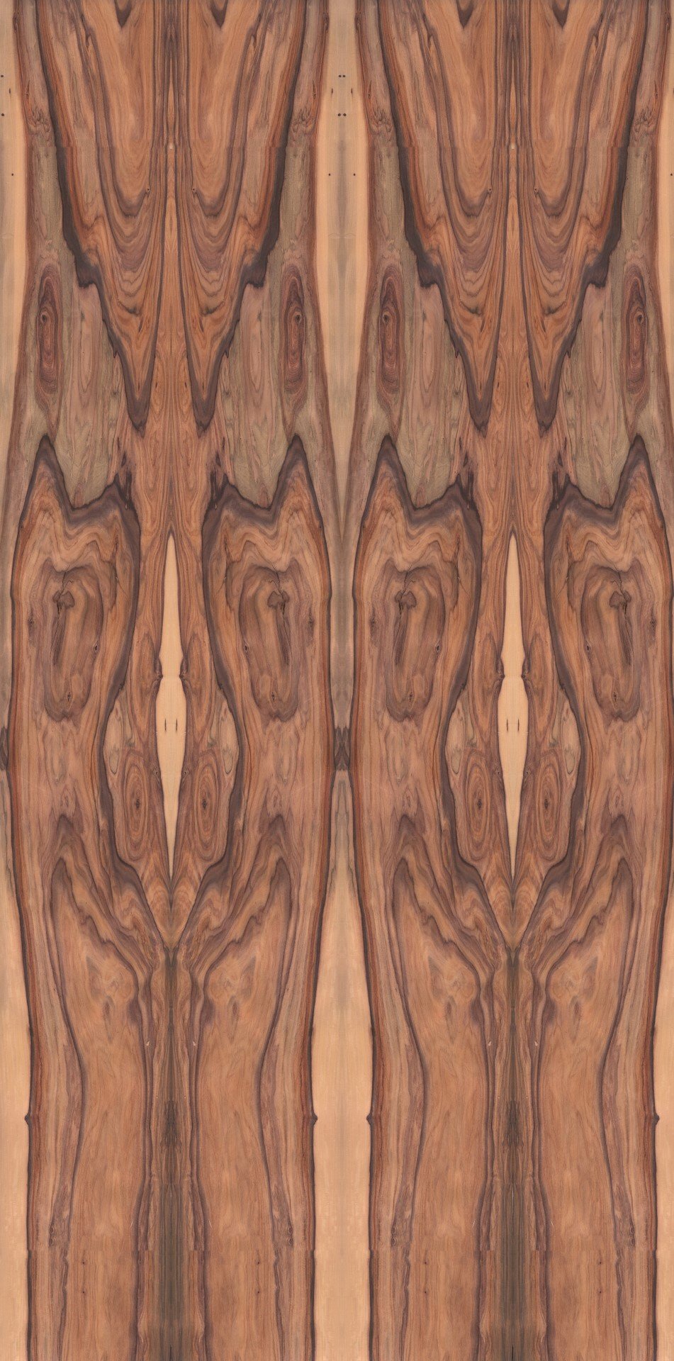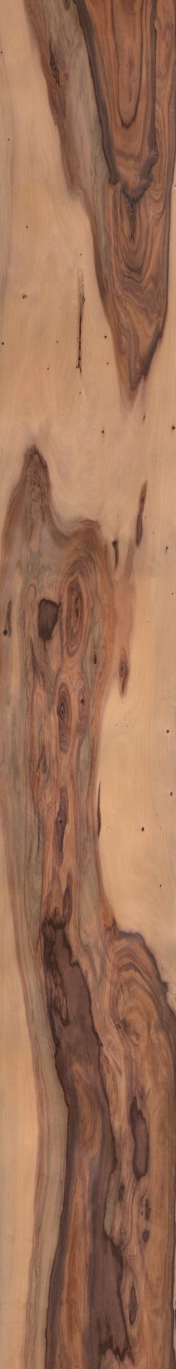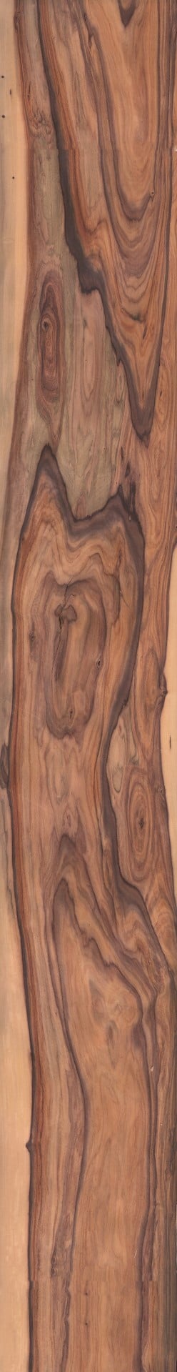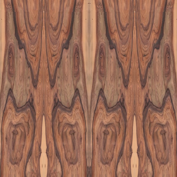 The basic shade of the santos rosewood varies between yellowish-red and violet-brown. This log inspires with its lively character. The light yellow sapwood surrounds the wild core – this composition creates a fascinating veneer look. Available as sliced veneer.