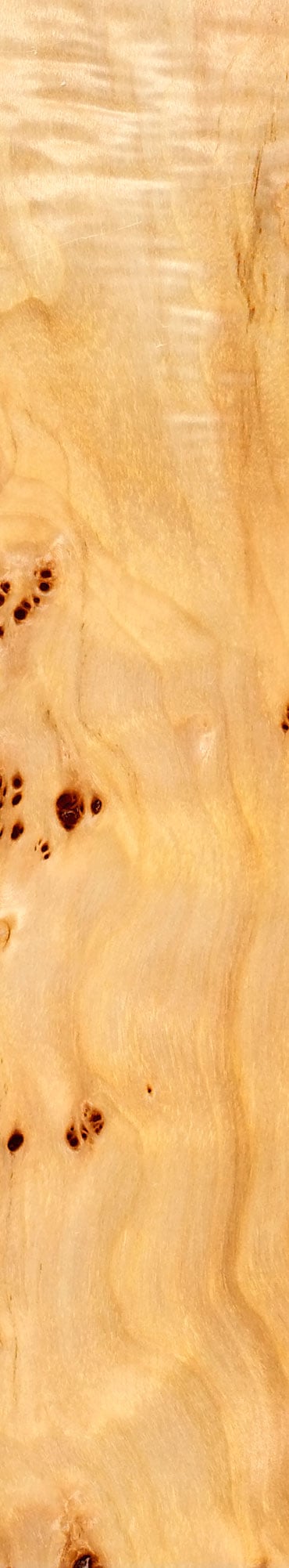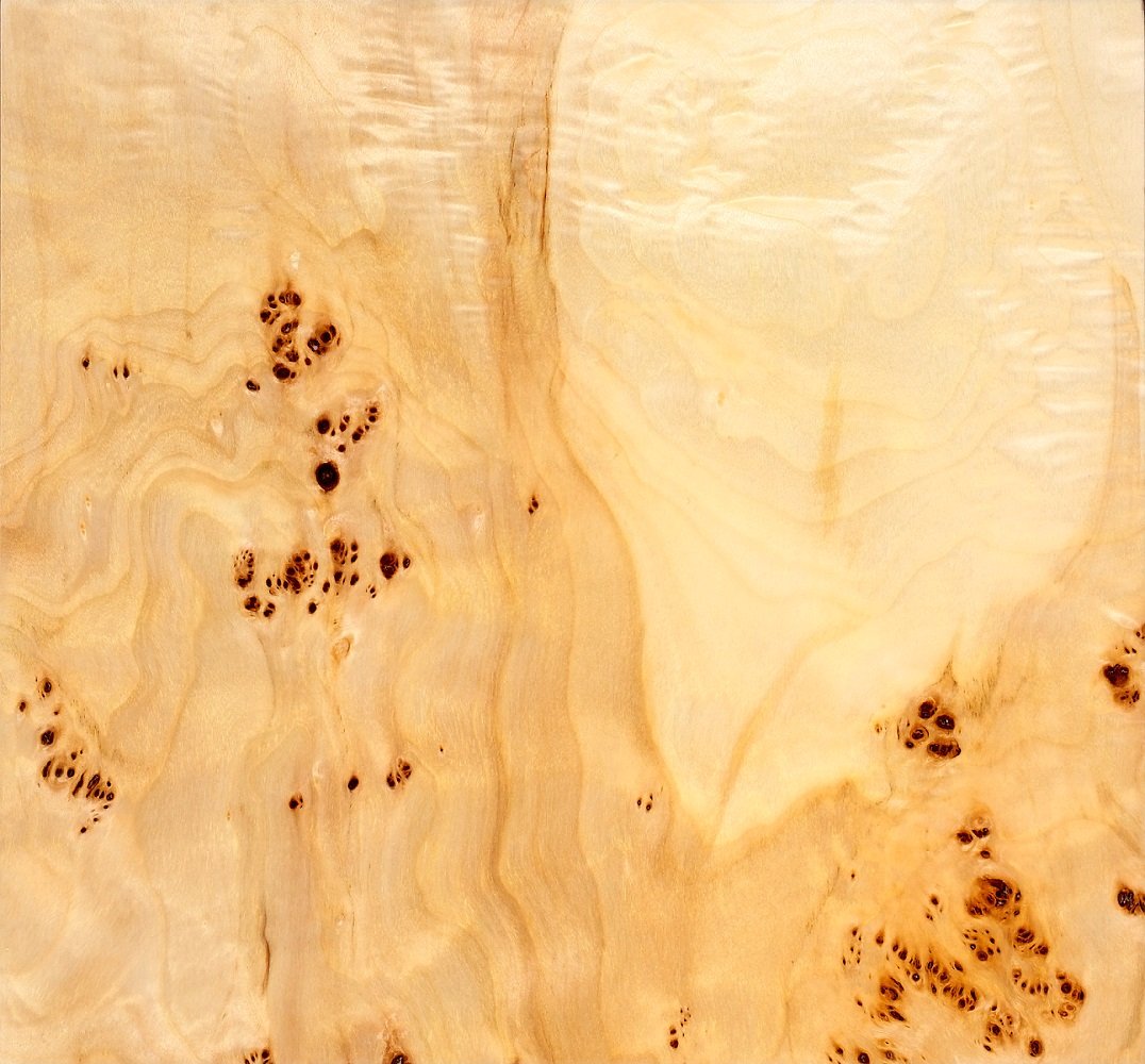 The grayish white to mellow light brown color of the poplar is enlivened by the presence of scattered nests of clusters. The dark and almost black cores of the clusters are clearly highlighted against the light background of the wood. Wavy annual growth lines running between the nests of clusters complement the veneer figure with softly changing effects.