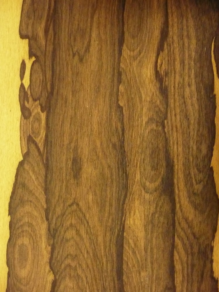 Brownish color with lighter sections and dark distinguished lines, sometimes in combination with thedecorative yellow sap. The lively structure, often in long cloudy forms looks like Brazilian Rosewood.