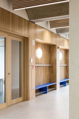 The Freiham elementary school in Munich shows how veneer can also be used for acoustic purposes. Sound-absorbing acoustic panels made of oak veneer were installed here, which optimize the sound in the classrooms and thus create a quiet learning environment. At the same time, the natural wood brings a warm look to the modern rooms.