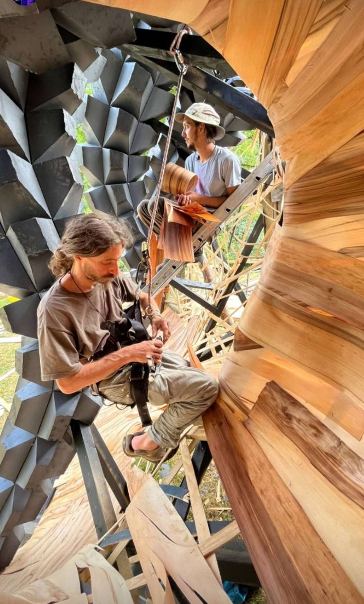 It is a source of deep joy and pride to see one’s own product as an integral part of a masterpiece. Particularly, it has been utilized in crafting an installation resembling a colossal octopus which, through its mechanism, evokes the impression of a robot. 4000 square meters of Satin Walnut veneer from Schorn & Groh – veneer manufacturer based in Southern Germany – were used for this amazing application. Known for its beguiling aroma with a hint of vanilla, the Satin Walnut veneer is a testament to unparalleled craftsmanship. Characterized by its irregular grain, fine texture and luxurious sheen, this wood exudes elegance in every detail. The creamy white, reddish-colored sapwood forms an elegant contrast to the shiny rosé to reddish brown and grey heartwood.