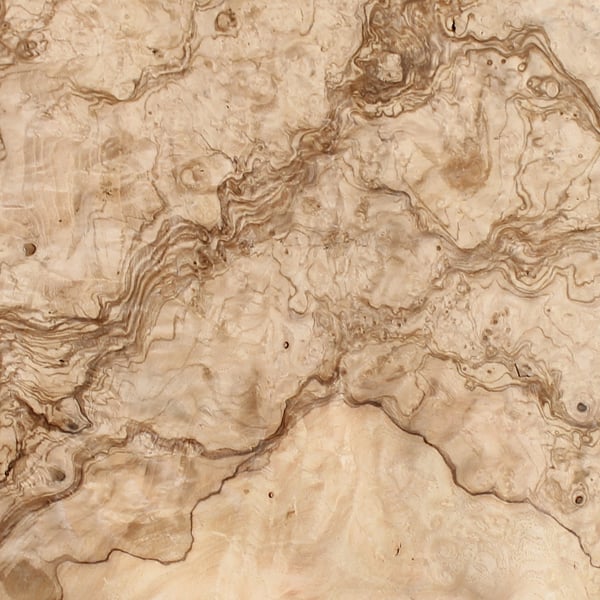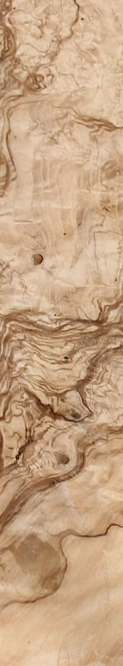 Ein ganz anderes Erscheinungsbild erhält die sonst zarte Eschen Maser durch das Vorhandensein des Olivkerns. Die abwechselnd dunkelbraunen und hellbraunen welligen Jahrringstrukturen werden durch den Maserwuchs zu zahlreichen farbigen Wirbeln verschlungen. Durch diesen markanten Farbkontrast erhält das Maserbild der Olivesche ein sehr lebhaftes und bewegtes Aussehen.