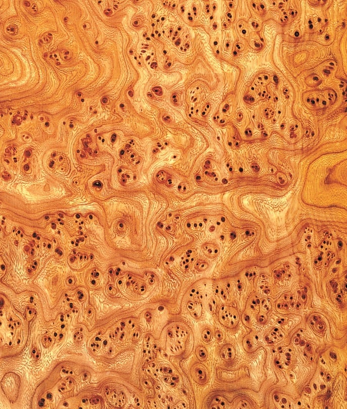 Mit seiner orangebraunen bis rötlichbraunen Farbe wirkt die kostbare und äußerst seltene Rüster Maser sehr elegant. Die überwiegend in Gruppen angeordneten Maserkerne werden von welligen und kreisförmigen, oftmals grünen Linien sanft umhüllt, was dem Gesamtbild ein weiches und harmonisches Aussehen verleiht. Leider wegen dem Ulmensterben sehr selten geworden.