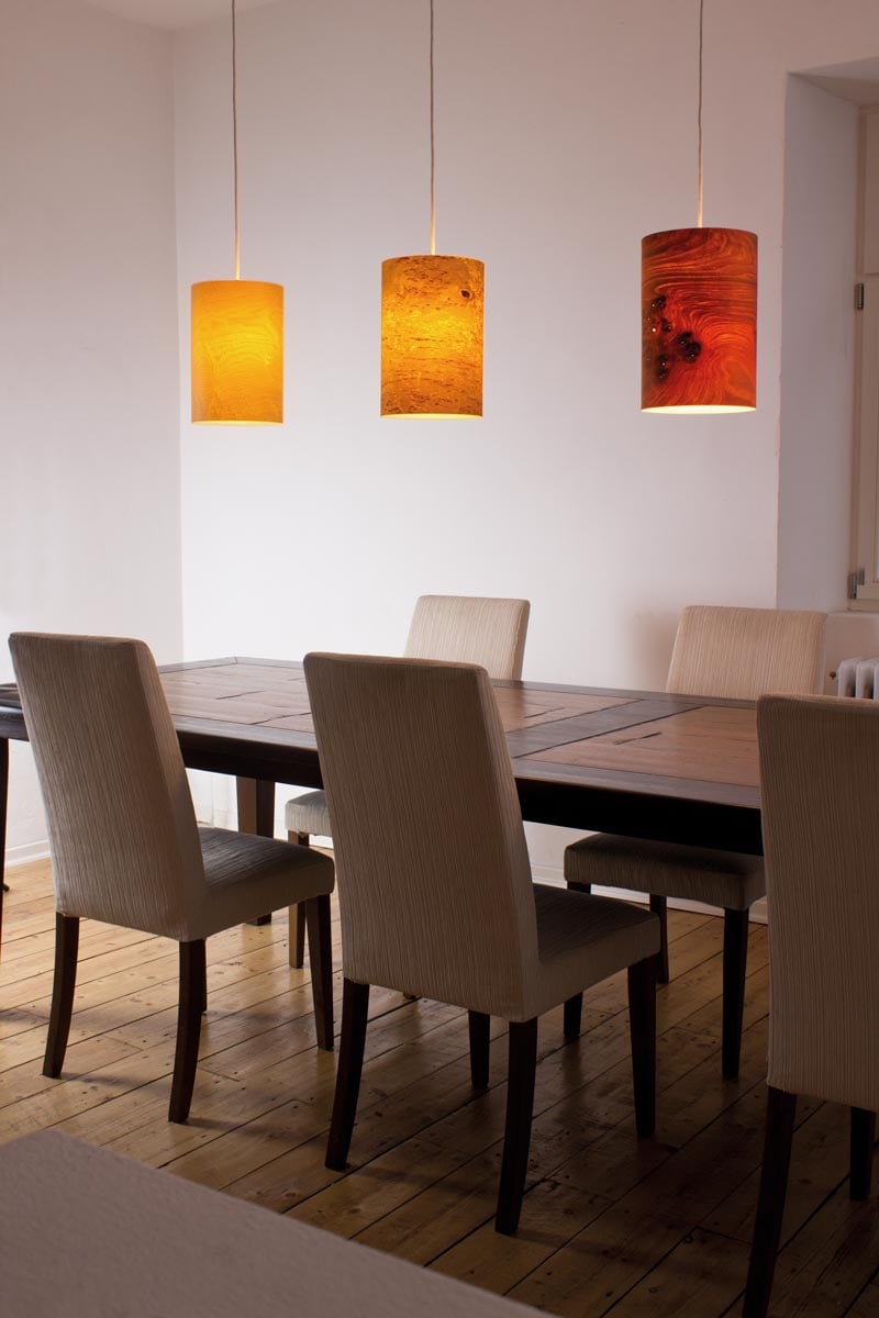 Hinterleuchtete Furniere vereinen die natürliche Schönheit von Holz mit innovativer Lichttechnik. Durch die feine Struktur des Furniers entsteht eine transluzente Optik, die warmes Licht in den Raum strahlt und so eine einzigartige Atmosphäre schafft. Jedes Furnierblatt ist ein Unikat mit individueller Maserung, was jedem beleuchteten Objekt einen besonderen Charakter verleiht.