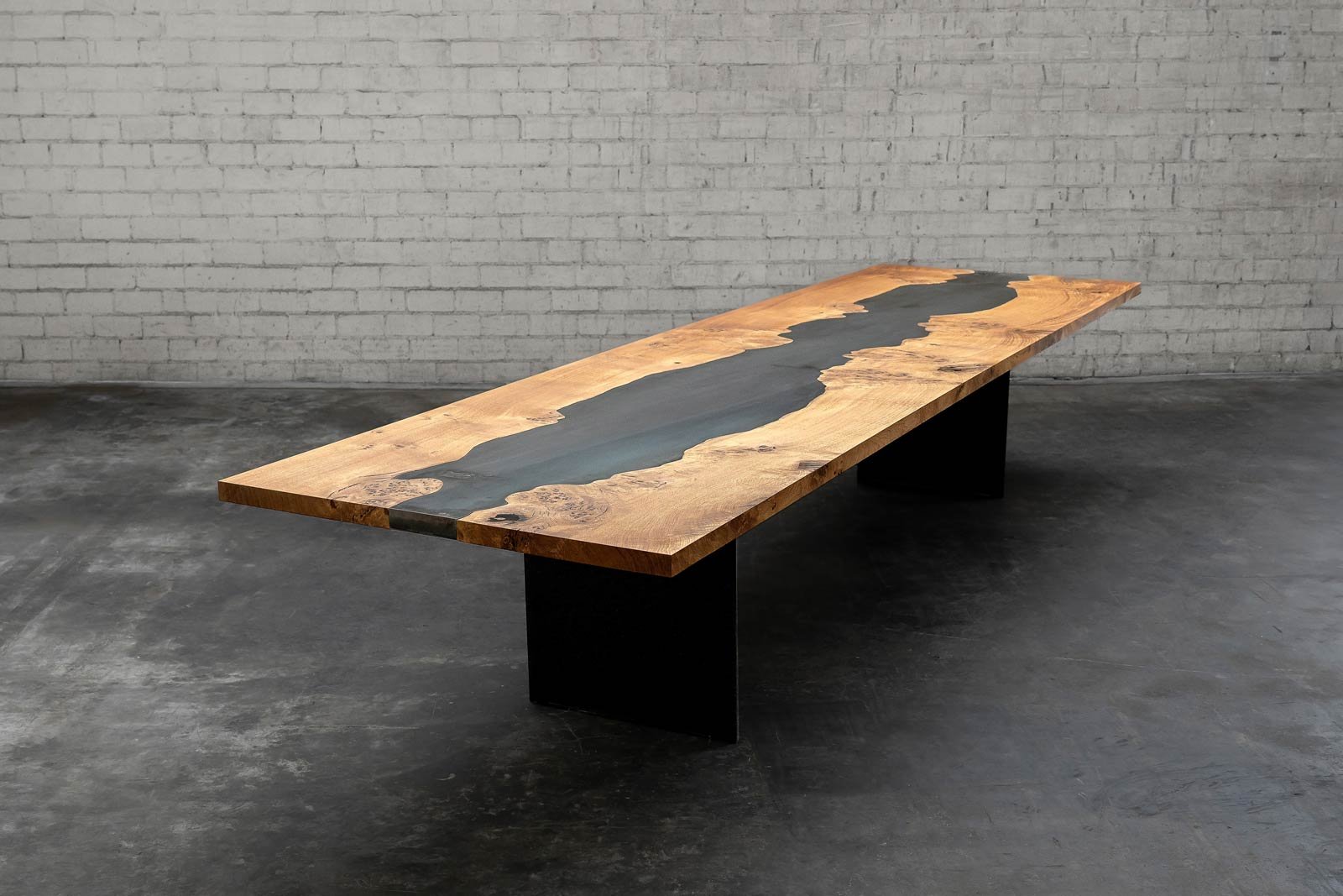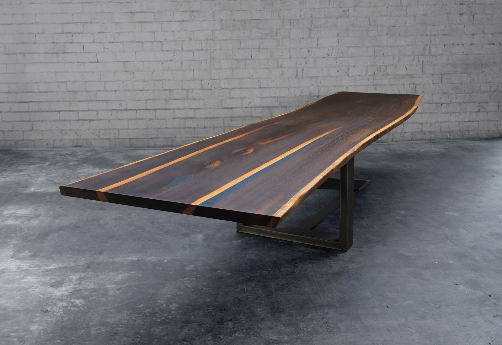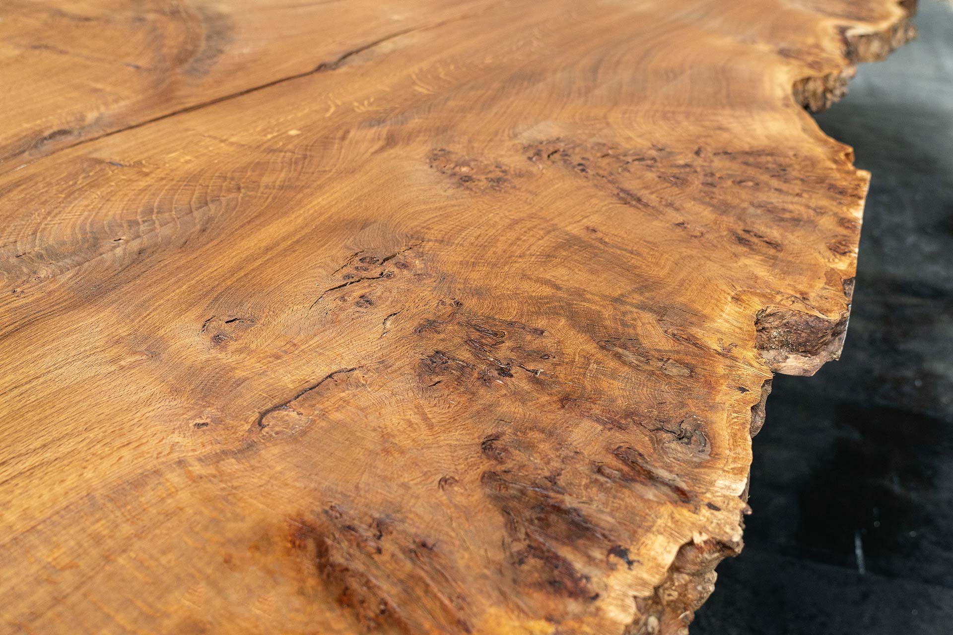 Rarität mit „Mondring“: Diese Tischplatte aus einer geräucherten europäischen Eiche vom Starnberger See hat es in sich. Nur etwa 1 Prozent der Eichen in Deutschland haben einen im Kernholz eingewachsenen, zweiten Splintring. Durch späte Frostperioden im Frühjahr können diese sogenannten Mondringe durch die Schädigung frischen Holzes entstehen. Das Räuchern der 4,30 m langen massiven Eichenplatte brachte den Splintring aufgrund der fehlenden Gerbsäure noch weitaus stärker zum Vorschein und macht ihn heute zu einem absolut seltenen Schmuckstück.
